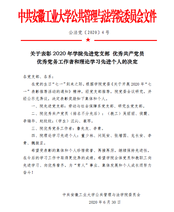 关于表彰2020年美高梅娱乐城 先进党支部优秀共产党员优秀党务工作者和理论学习先进个人的决定