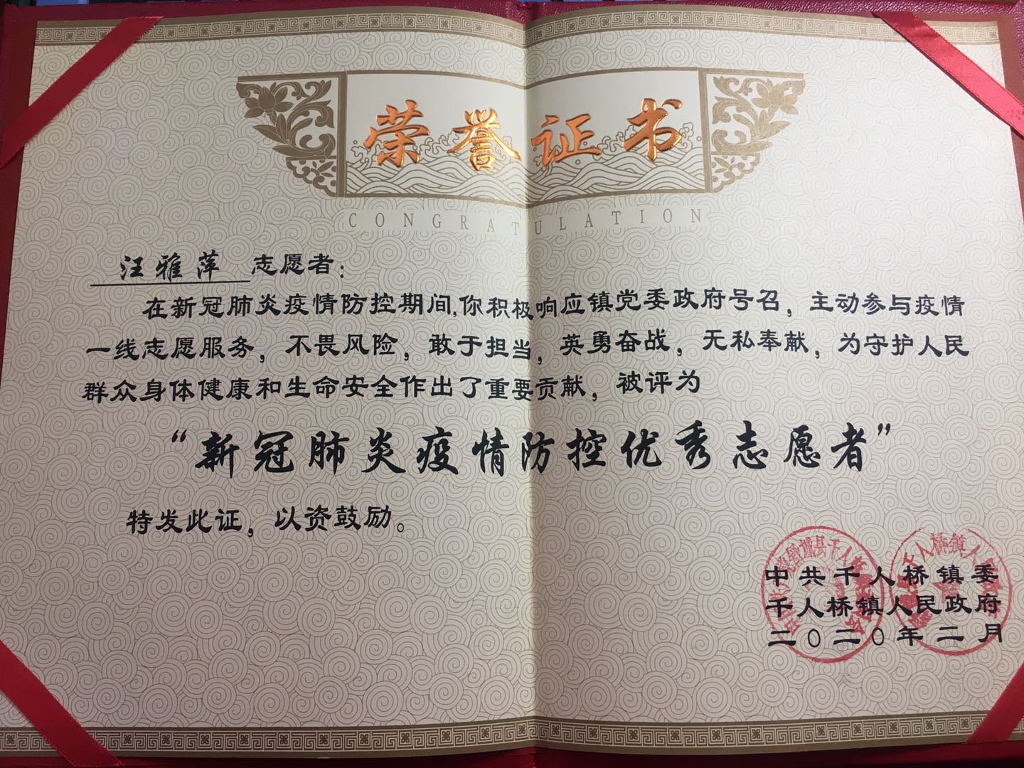行政管理2017级汪雅萍同学,家在安徽省六安市舒城县千人桥镇。2月7日,她就主动报名加入疫情防控志愿队伍,承担起检疫卡口来往车辆的检测、登记工作。连续11天,汪雅萍每天工作7个小时,因为她说多做一点,村民感染风险的几率就小一点。一个人的力量是微小的,但星星之火可以燎原,她扩充志愿者队伍,让更多的人参与到村委会疫情防控组织中来,形成以她为副队长的青年志愿者队伍。深入乡村发放宣传资料,花样讲解疫情防控知识,让村民们稳定心态科学防疫。有一次她在介绍“七步洗手法”时看到一位老爷爷没戴口罩,把自己每天仅有一只的口罩给了他 ,还教村民们如何正确使用口罩。每一天,在千人桥镇与百神庙镇交叉的卡点上、在农户家门口、在村广播中,都有一个笔挺的身姿、青春的面孔悦耳的声音。新冠疫情防控中,舒城县零病例。近日,千人桥镇党委、镇政府授予她“新冠肺炎疫情防控优秀志愿者”称号。汪雅萍同学说“这是大家都期待已久的结果,也是我们每一个人付出的价值。”她兴奋地说,终于可以安心上美高梅娱乐城