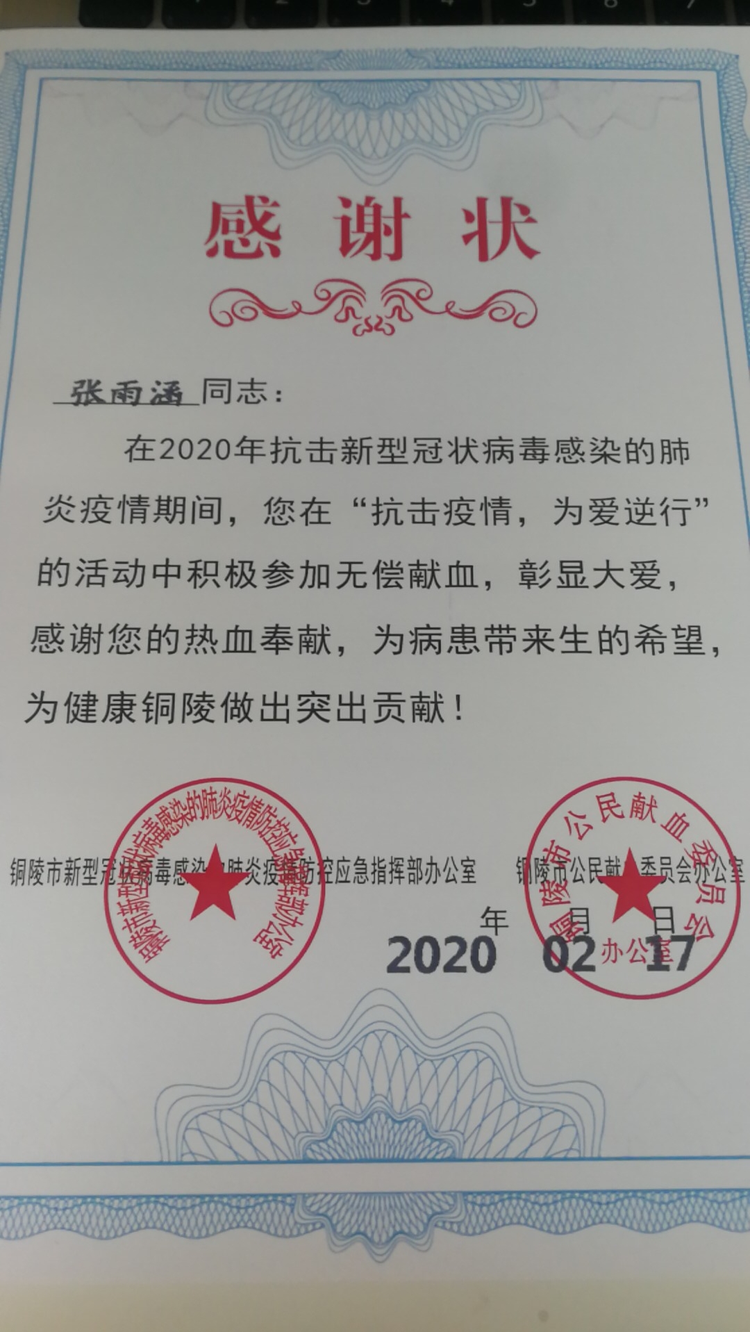 事管本科2017级张雨涵,家在铜陵。听说疫情防控血库告急的信息后,2月17日,主动在“抗击疫情,为爱逆行”活动中参加无偿献血。