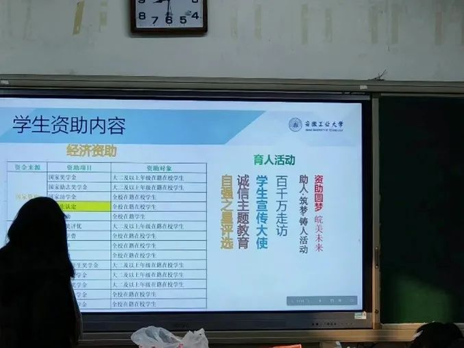资助育人、助力梦想放飞的PPT。同时提前与母校老师对接,约定好资助政策宣传活动的开展时间和地点,由老师安排无为中学高三年级部分家庭困难学生和高三十九班全体同学参与本次宣传活动。