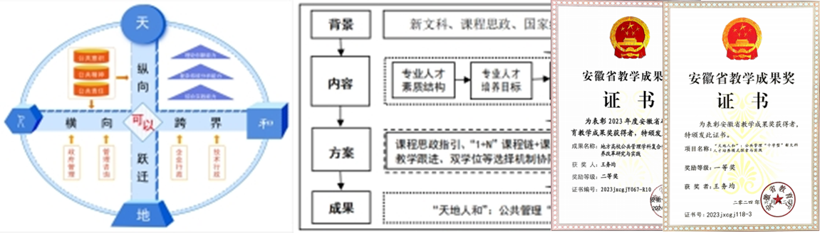 拥有获批国家级首批新文科研究与改革实践项目、省级教学改革研究重大项目、省级“六卓越一拔尖”卓越人才培养创新项目、省级卓越法治人才教育培养等高级别教研课题10余项,主持省校两级教学研究项目和质量工程项目70多项,荣获省校教学成果奖三项,其中《“天地人和”:公共管理“十字型”新文科人才培养模式》获得省教学成果一等奖。