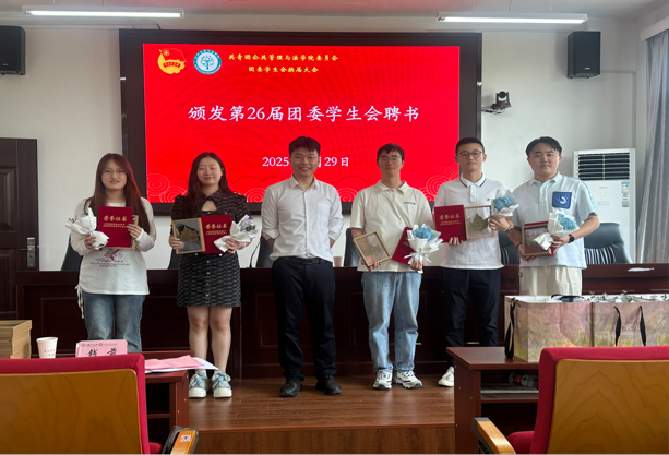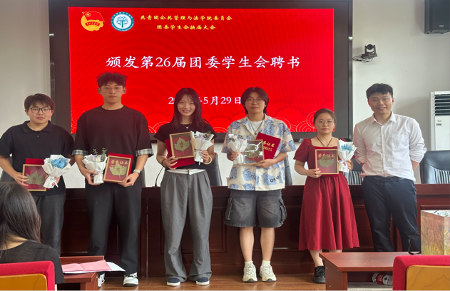 团学工作再上新台阶。大会还为第26届院团委学生会各部门负责人颁发聘书,并由新一届各部门负责人献花。