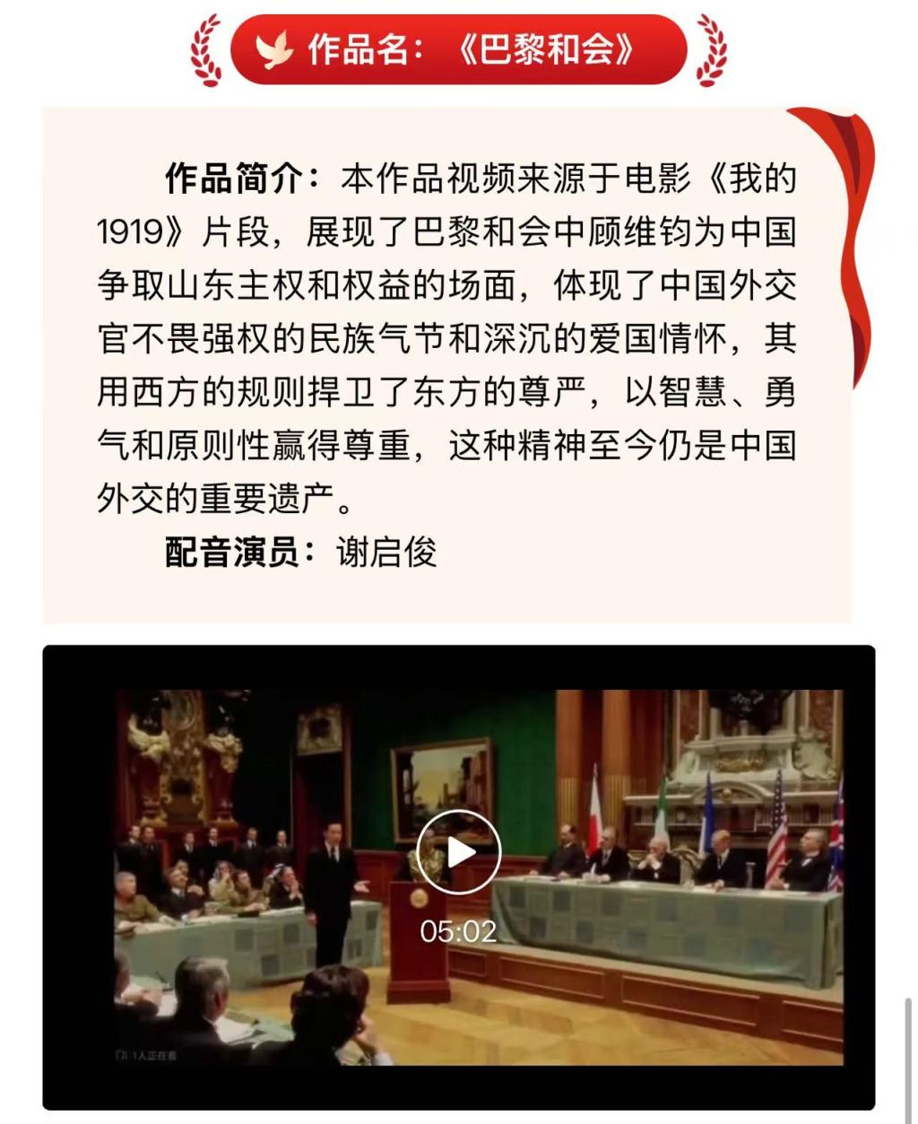 谢启俊凭借精准的诠释和独特的创意脱颖而出,荣获一等奖。这段视频素材节选自历史题材影片《我的1919》//mp.weixin.qq.com/s/anj01z9DdEZXMHGX3Stmdw,生动再现了巴黎和会期间中国外交家顾维钧为维护国家主权而据理力争的场景。展现了近代中国外交官的民族气节与爱国情操,至今仍深刻影响着当代中国的外交实践。彰显出美高梅娱乐城