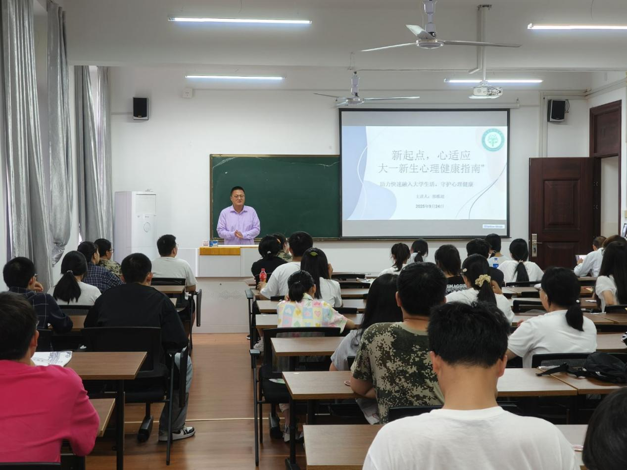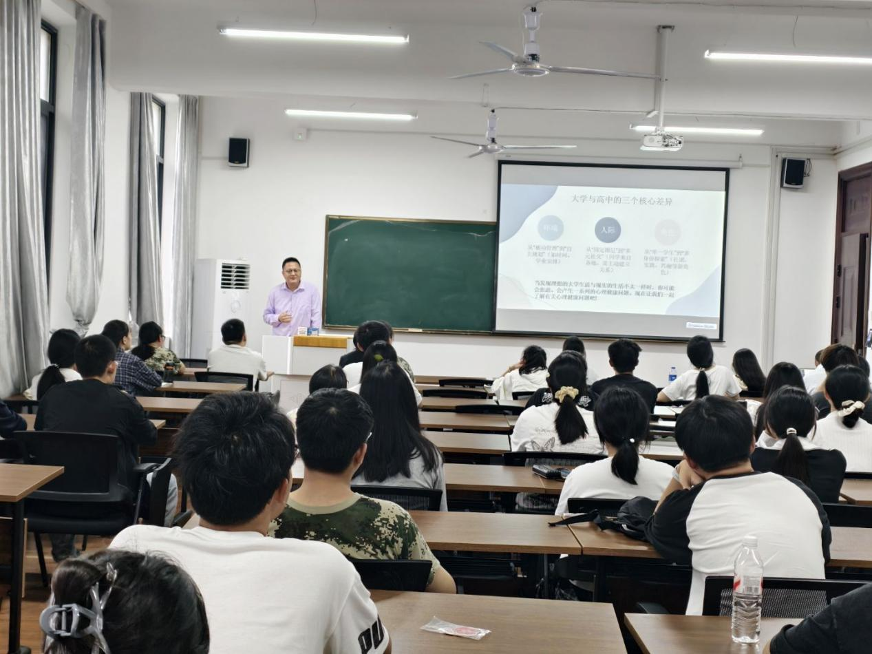 心理协会在公法楼举办了"新起点,心适应"主题心理讲座。本次讲座特邀院心理工作站负责人邢维迢担任主讲,50名新生现场参与。
