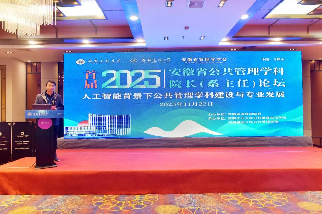 办学历史以及在学科发展、专业建设等方面取得的成绩。他指出,党的二十届四中全会为“十五五”时期发展擘画蓝图,其中“进一步全面深化改革取得新突破”“推进治理体系现代化”等重要部署,与公共管理学科的新使命新任务高度契合。举办首届(2025)公共管理学科院长(系主任)论坛是安徽省公共管理学科发展史上开创性、里程碑式的重要事件,意义重大。本次论坛聚焦“人工智能背景下公共管理学科建设与专业发展”这一主题,正是深入学习领会习近平总书记关于社会治理的重要论述,认真贯彻落实党的二十大和二十届历次全会精神的具体实践,也是我省公共管理学科主动服务国家重大战略需求、积极赋能省域高质量发展的生动体现。