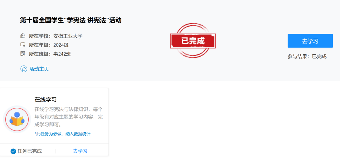本次活动以线上学习为主要形式,依托教育部全国青少年普法网及对应小程序作为学习平台,内容围绕宪法核心要义设置系列专题学习视频,涵盖宪法的基本内容、发展历程、现实意义等重点内容,确保学习内容权威、系统。活动前期,工作人员发布活动通知与操作指南,在线解答学生登录、学习过程中的各类问题,同时每日统计学习进度、提醒未完成学习的学生,保障活动全程规范有序、覆盖全员。活动期间,同学们参与热情高涨,线上学习完成率显著提升,许多同学在学习后主动分享宪法学习心得,交流对法治精神的理解。
