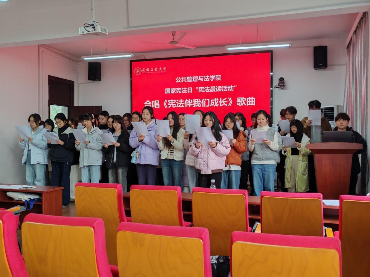 本次“宪法宣传周”系列活动形式多样、内容丰富。在宪法晨读环节,主会场的同学们庄严肃穆地跟读宪法条文,洪亮的朗读声响彻四周,展现出对宪法的敬畏与尊崇。各班级分会场同学们广泛参与,认真朗读宪法条文,学习体会宪法精神。通过集体晨读,公法学子进一步明确了宪法的根本属性与核心价值,更清晰地知晓了公民的权利与义务,有效增强了宪法意识和法治观念。在合唱《宪法伴我们成长》时,同学们青春朝气的歌声将现场气氛推向高潮。此次活动帮助同学们树立了“守宪法、护宪法、用宪法”的自觉意识,为后续法治教育工作开展奠定了坚实基础。