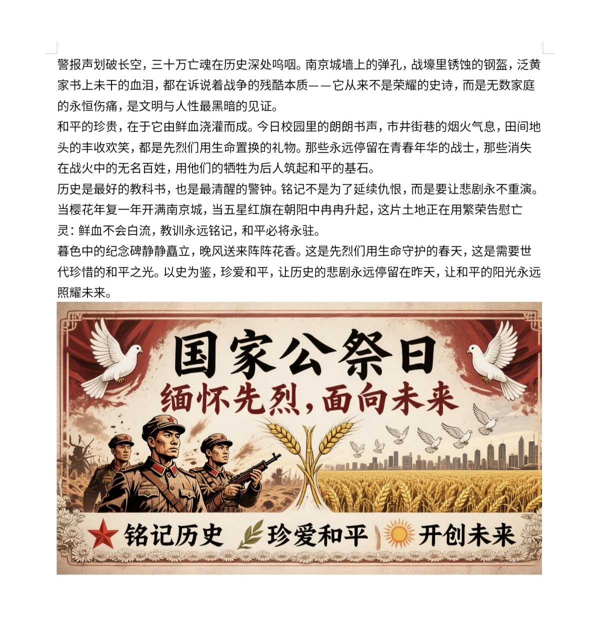 活动以文字创作为核心载体,参与学生围绕活动主题撰写文章,将对历史的铭记、对遇难同胞的悼念与对和平的期许凝于笔端。学生们结合南京大屠杀史料与自身感悟,或追溯苦难历史、讲述先烈抗争事迹,或抒发爱国情怀、立下时代担当誓言,文字质朴却情感真挚,字里行间满含对历史的铭记与对和平的珍视,展现出公法学子深厚的爱国热忱与历史责任感。