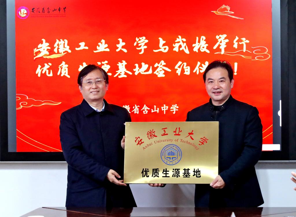向含山中学授予“安徽工业大学优质生源基地”牌匾,与含山中学签署了优质生源基地建设合作协议,送上2021-2022学年度美高梅娱乐城