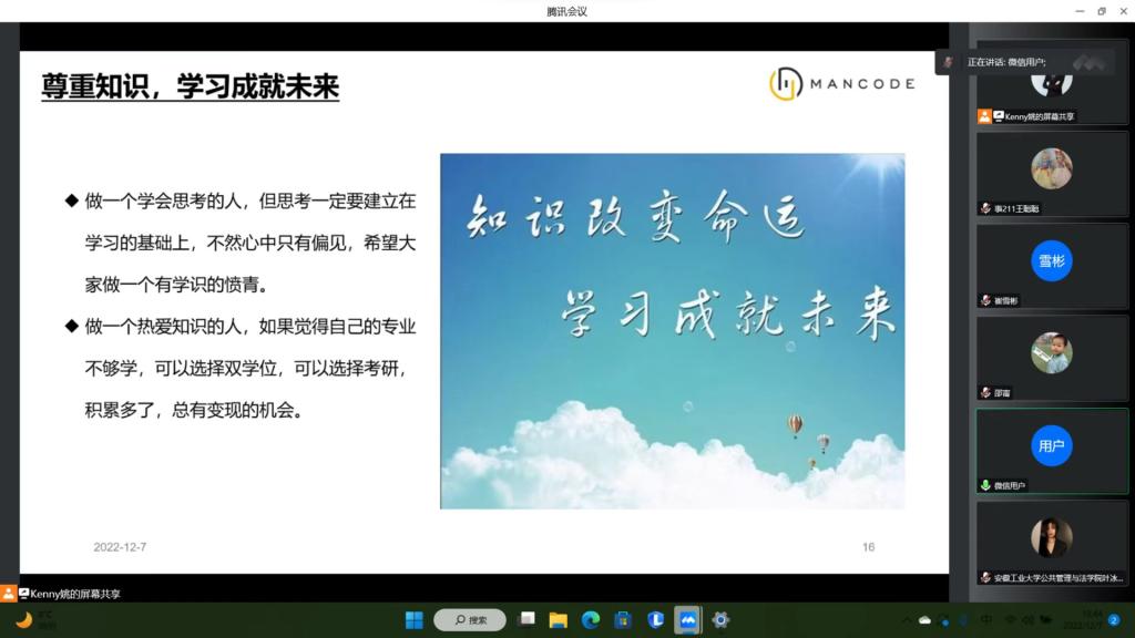 姚明学长通过汽车、新能源等中国行业的内卷化现象分析,说明未来职场是重视能力、尊重知识的,他进一步结合他同学发展现状,说明知识是可以改变命运的,大学生在校期间需要努力学习,多参加社会活动和兼职活动方能锻炼意志,不断提高自身能力,才能立足时代,成就自己的未来。最后,姚明学长再次强调大学期间应坚持做难而正确的事情,这样才会不畏将来,不负韶华。