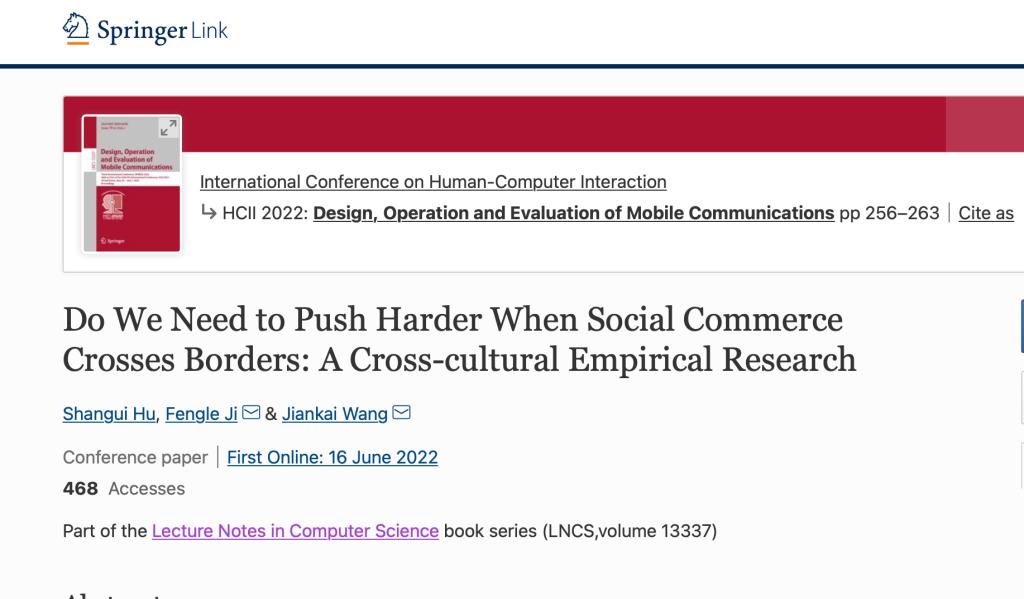 王建凯同学在 HCII 2022在线发表最新研究成果 “Do We Need to Push Harder When Social Commerce Crosses Borders: A Cross-cultural Empirical Research”(//link.springer.com/chapter/10.1007/978-3-031-05014-5_21)。胡善贵副教授为第一作者,美高梅娱乐城