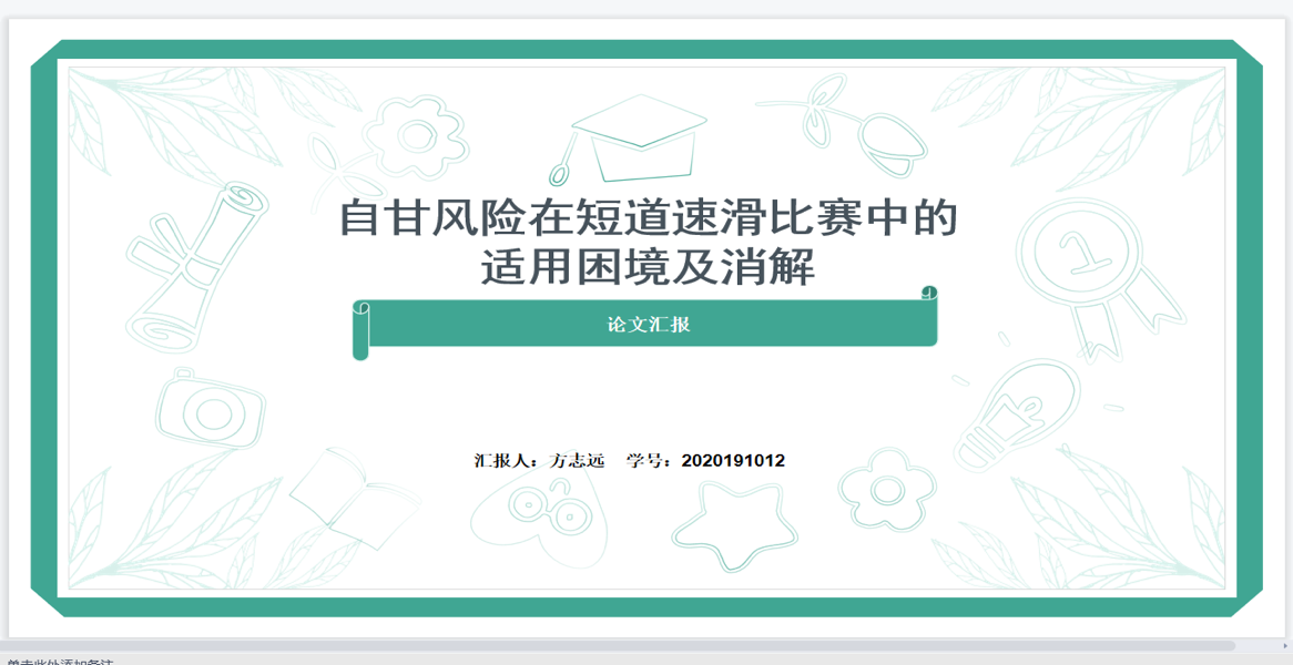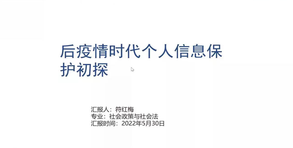 本次论坛流程如下:首先由汇报人分享论文结构及内容,其次由三位老师依次进行点评,最后由其他同学进行互动交流。三位汇报人均为2020级社会政策与社会法专业的研究生,第一位汇报人是符红梅同学,汇报主题是:“后疫情时代个人信息保护初探”;第二位汇报人是方志远同学,汇报主题是:“自甘风险在短道速滑比赛中的适用困境及消解”;第三位汇报人是胡宇昂同学,他汇报的主题是:“人格权禁令的非诉化程序研究”。报告过后,三位老师充分肯定了同学们的研究成果,但更重要的是就其中存在的问题,如用词表达、问题意识、写作方法与内容、选题现实意义、引用案例资料、观点聚焦、结构体系、摘要撰写中存在的问题等提出了宝贵的意见和建议。鞭策同学们撰写学术论文应严肃、认真、科学,避免出现“虚浮不实”、“心浮气躁”、“长于套用”等问题。激励同学们善于挖掘问题,主动掌握科学的写作方法、格式和思路,增强自身综合学术素质。