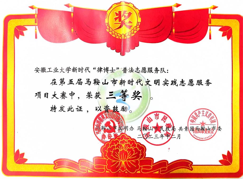 级普法宣传平台,以青年力量进行法制宣传教育,不断增强普法宣传面及法治的渗透力,经过项目决赛角逐,“律博士”普法志愿服务队获马鞍山第五届新时代文明实践志愿服务项目大赛三等奖。