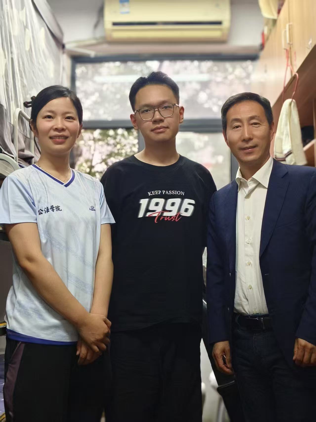 党委副书记、纪委书记、学生工作副院长周浩然携2023级辅导员专程前往学生宿舍看望造血干细胞捐献志愿者、2023级法学专业法231班潘旭辉同学,对其无私奉献、挽救生命的善举表达高度赞扬与深切关怀。