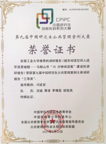 历来重视培养MPA研究生“经世致用”能力,以此次获奖为新的起点,继续积极组织MPA学生参赛,争取下一届在参赛案例数量和获奖等次方面都能再上一个新的台阶。(撰稿:问延安 审核:周彩霞,杨哲)