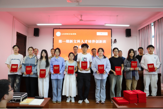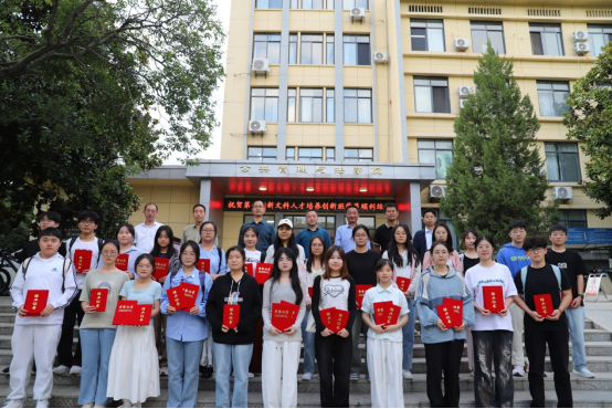 新文科建设的举措和获得省教学成果奖的基本情况,并勉励大家继续保持进取心,发挥示范引领作用。老师们为获奖同学颁发了获奖证书,首期学员领取了结业证书。张增国从课程安排与效果、科研竞赛与技能、社会实践和班级管理等四个方面,总结汇报了第一期“创新班”取得的丰硕成果和同学们展现出的综合能力与素养,鼓励同学们梦想从这里启航,在接下来的学习时光中不忘初心、继续努力。